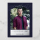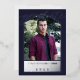 Elegant navy blue and silver graduation invitation personalised with one photo on the cover and three more photo on the back. Double sided graduation invitation printed with silver foil against a navy blue background with the graduate's photo in a silver frame. 2 in 1 graduation announcement and invitation personalised with photos and the graduate's name on silver foil.