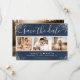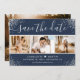 Modern custom navy blue and silver wedding photo save the date card featuring an elegant script font and a photo collage on a navy blue background adorned with silver confetti. Easily personalise this card with your images and wedding details including a wedding website if applicable.