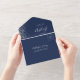 The left-hand edge of this elegant modern all-in-one wedding invitation and RSVP features a silver faux glitter border. The customizable text combines silver gray whimsical handwriting, copperplate and italic fonts on a navy blue background. The return address appears on the outside flap and the reverse side of the detachable RSVP card in silver gray text on solid navy blue. A QR code is included on the RSVP card for guests who would prefer to reply online.
