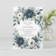 A sophisticated wedding featuring a navy blue watercolor floral wreath adorned with lush peonies, roses, and eucalyptus greenery in shades of navy blue, green, and ivory. The design is enhanced by a silver-grey printed box beneath the wreath with modern font text layout. The back of the invitation continues the theme with a matching floral arrangement for a cohesive and elegant look. Perfect for couples seeking timeless and classy wedding stationery.