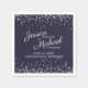 Navy blue wedding reception (bridal shower, rehearsal dinner, etc.) paper napkins with silver glitter and white text. Personalise with the couple's names, wedding date and location.