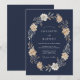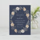 This design features a deep navy blue background that provides a striking contrast for the soft botanical elements. A delicate arrangement of creamy white roses and muted peach blossoms is intertwined with silvery eucalyptus leaves and dainty berry sprigs. The colour palette creates a sophisticated mood perfect for a formal winter or evening event. The hand-painted watercolor style adds a touch of timeless elegance to the floral display.