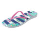 These pretty flip flops feature a beautiful teal green, gold, pink and white seashell pattern laid over and under a navy blue stripe background. Bright and colourful for the beach, but fancy enough to wear anywhere!