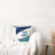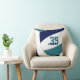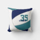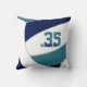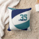 This volleyball themed throw pillow for the kids' sports room features a simple, abstractly oversized navy blue, teal and white volleyball that covers the entire pillow - athlete's name and jersey number are positioned off centre on the front and back - by katz_d_zynes