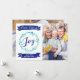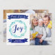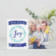 Custom peace, love and joy christmas photo card in navy blue and turquoise with watercolor pattern wreath and vintage banners.