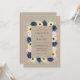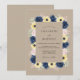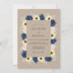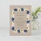 This design features a sophisticated arrangement of navy blue and pale yellow anemones alongside soft blush pink roses. The botanical elements are set against a warm tan background, creating an earthy and refined aesthetic. Muted leaf foliage and delicate greenery add depth to the floral display. This artistry evokes a timeless and romantic mood for a special seasonal ceremony.