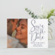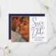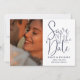 This navy blue elegant script wedding save-the-date invitation can be personalised with your two special photos, wedding day information, and wedding website QR code. Designed by Thisisnotme©