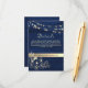 Elegant, modern, rustic wood navy blue wedding details card with website, vintage gold floral lace and string lights.