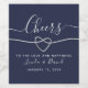 Modern, minimalist, elegant, simple handwritten calligraphy script navy blue wedding wine label with silver rope heart. Cheers to the Love and Happiness.
