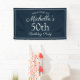 Navy blue and white 50th birthday party banner for a woman's celebration. Text is an elegant calligraphy script font. Contact us for help with customisation or to request matching products.