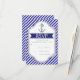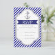 Navy blue, white stripes and anchor nautical wedding RSVP reply/response card. A stylish striped pattern design with navy blue, white diagonal stripes, an anchor with a blue heart and rope and your text in a frame with a banner. Modern yet with a vintage look in a sense. You can change background and text colour choosing from over 200 colours from Zazzle colour chart. This classy design is a completely customisable template and is part of a wedding set perfect for a summer wedding.
