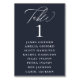 Elegant white calligraphy "table", with guest names listed and table number, wedding table number seating chart card. Background colour shown in navy blue, can be customised.