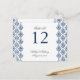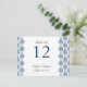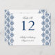 Use the personalise option to change the table number on these elegant navy blue and white damask arabesque table cards. Please NOTE: You MUST change the table number on each card and add one of each number to your cart. If you want to do more extensive changes including changing the font, font colour, or font size use the customise option.