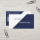 Modern navy blue and white geometric business cards feature your name on the front in navy text on white and white text on navy. The back features a customisable QR code, your job title/speciality/company name, and contact information on a reversed dark blue and white colour block pattern to the front. Personalise the QR code with your portfolio or website link and add your text in the sidebar.