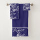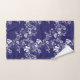 This bathroom towel set features a pretty white ocean themed design on a navy blue background. The hand towel and wash cloth have the pattern repeated across the entire surface; the large bath towel has the pattern as a bottom border, with a matching solid navy blue interior. Be sure to see the matching products, including shower curtains, in our store.