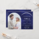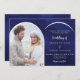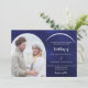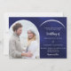 A navy blue background, photo arch wedding invitation. The blue background i uneven. White text.