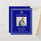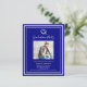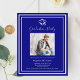A navy blue background, decorated with a white frame, and a graduation cap. Personalise and add a photo name and details. White text.