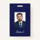 Navy blue background, white text. A badge, name tag for large events such as milestone birthdays, wedding, conventions or business fairs. Add a photo and a name
