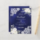 For an elegant and romantic wedding. A navy blue, uneven coloured background decorated with white florals, roses and white lace. Personalise and add your names and details.