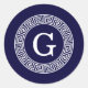 Navy Blue Wht Greek Key Rnd Frame Initial Monogram Classic Round Sticker