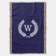 Navy Blue Wht Wheat Laurel Wreath Initial Monogram Throw Blanket