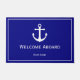 Welcome visitors to your boat. The white boat anchor is above the text. You can add the boat name and your message under the anchor. All text is white and can be edited or deleted. The mat is navy blue.