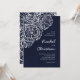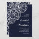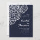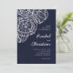 Modern wedding invitation featuring white outlined lineart poppy flowers on a navy blue textured background.
