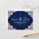 Navy blue rustic country wedding save the date postcard featuring elegant floral lace against a navy blue wood background.