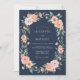 Delicate blush pink and peach blossoms intertwine with lush green foliage, creating an elegant floral wreath. This design evokes a feeling of tender romance and sophisticated charm, perfect for a memorable occasion. The deep navy background provides a striking contrast, enhancing the vibrant bloom details.