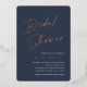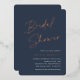 Invite guests to celebrate the bride to be with these modern and minimal bridal shower invitations with stunning rose gold foil accents. Simple design features "bridal shower" in casual handwritten script, with your event details aligned at the right in modern white lettering on a dark navy blue background.