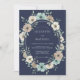 This design features a charming circular arrangement of soft blossoms and delicate foliage in muted blues, creams, and blush tones. The botanical elements evoke a gentle, romantic atmosphere, perfect for an elegant celebration. The overall impression is one of refined natural beauty.