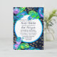 This is a majestic and artsy Bat Mitzvah invitation for your young teenage girl's special event. It depicts a hand-painted bright lime green, turquoise green, purple, neon pink, and neon yellow butterfly, flower, and tropical leaves arrangements around a circular blue watercolor border on top of a dark navy blue night sky. In the background are beautiful glowing yellow fireflies to light up and glow against the sky. It's elegant, modern, artistic, pretty, and unique!