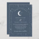 A celestial moon and star themed wedding invitation with a navy grey background and white text with elements. Customise the colour of the star pattern, background, arch fill and moon element!