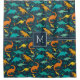 Personalize this cute dinosaur themed shower curtain with your child’s single initial monogram in white lettering for a cool custom touch! Created especially for dino-loving kids, this colorful design features orange, yellow, and mint green dinosaur illustrations on a navy blue background.