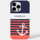 Simple contemporary ship anchor, on a classic and chic navy blue and light summery peach orange, coral red coloured stripes pattern. With room to personalise or customise with a name, initials, or monogram of your choice on a white coloured background. Beautiful, modern, and cool cover for the trend-savvy and art-loving hip trendsetter, artsy motif lover who wants to protect their phone from dust and dirt, wear and tear. This design is available in Apple iPhone 6, 7, and 8 Plus, 10 or X, XR, XS, 11, 12, 13 Mini, 14, 15 Plus, and Pro Max cellphone cases. Show off your style, look fashionable trendy, and feel stylish with a unique design on a mobile device accessory of your choice.