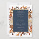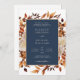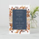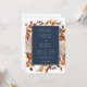 Navy Fall Floral Wedding Invitation. This elegant wedding invitation features beautiful hand-painted watercolor burnt orange and terracotta leaves, cream and beige dahlias, and beautiful rust and brown roses on a white background, perfect for an autumn wedding! The back of the invite has a beautiful branch of leaves with the bride and groom's monogram. Find matching items in the Navy Blue Autumn Romance Wedding Collection.