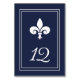 Elegant and simple Wedding Table Card featuring a fleur de lis against a Navy background. This design is a unique choice for a modern wedding. Easy to customise with the appropriate table number(s). Click "Customise It" to find more personalisation options.