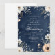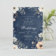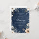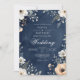 A dark navy background showcases a delicate floral arch with white and muted peachy blossoms and greenery. This design evokes a mood of sophisticated romance and natural beauty.