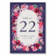 Navy Floral Wedding Table Number. Help guests find their seats with ease using these elegant table numbers, featuring a watercolor floral wreath in rich jewel tones of pink, burgundy, blues, and purple, set against a deep navy blue background. Personalised with your names and wedding date, this design is perfect for any season—adding a cosy, romantic touch to fall and winter weddings or a fresh, vibrant feel to spring and summer garden celebrations. Fully customisable, these table numbers enhance your reception décor with a seamless, coordinated look. NOTE: the text is Navy Blue to match the collection but can easily be changed.