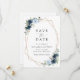 Invite friends and family in style and set the tone for your special day with this charming save the date card. Design features navy and blue watercolor flowers, greenery and gold frame on white background.