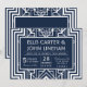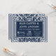 These wedding invitations feature an intricate geometric frame, geometric patterns, a navy blue and white colour palette, and other stylistic details all inspired by Art Deco and the roaring twenties. You can customise the sample text fields to your liking.