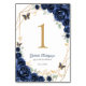 Navy gold and white Quinceanera celebration table number cards. Features, script font, gold butterflies, watercolor roses and tiara. Perfect for an elegant princess style glam celebration. Personalize with your own details. Printed Zazzle invitations or instant download digital printable template.
