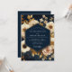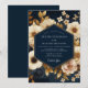 Embrace a moody and romantic atmosphere with this elegant artistic composition. A deep navy blue backdrop makes the luminous florals pop in shades of ivory, cream, and soft blush. Painterly white anemones and delicate roses are beautifully complemented by gilded amber foliage, creating a sophisticated design for your special day.