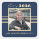This Class of 2026 stylish graduation sticker features gold stripes, photo frame, and text on a navy blue background.