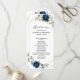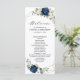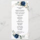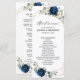 Dark navy blue floral wedding program card featuring elegant bouquet of navy blue, royal blue , white , gold, champagne ivory, blush colour rose , hydrangea, ranunculus, peony, flower buds and sage green eucalyptus leaves and elegant watercolor with round glitter geometric neutral frame. Please contact me for any help in customisation or if you need any other product with this design.