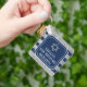 This navy blue, grey, and white striped Bar Mitzvah keychain is a perfect party favour for a classic Bar Mitzvah. This square Bar Mitzvah keychain favour has a navy blue and grey striped pattern behind a navy blue and white trimmed ticket-shaped text area that is personalised with the name and date of the Bar Mitzvah in white lettering below a grey Star of David at the top which can be removed if you want to use these for another type of event.