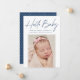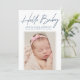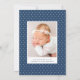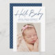 Modern birth announcement card featuring "Hello Baby" in a navy blue signature script with your baby's name, birth stats, and photo displayed below. The photo birth announcement card reverses to display an additional photo and personal message with a dark blue and white polka dot background.