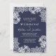 Simple and Timeless. A delicate white lace applique frames this stunning wedding invitation. Sample is shown with a classic navy blue background. Background colour can be changed to coordinate with your wedding theme.