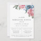 Watercolor floral arrangement in shades of mauve, navy blue and green, rehearsal dinner invitation. Chic and modern typography design. Back of card features solid navy blue colour.