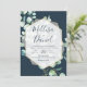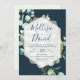 This Wedding Invitation features delicate hand-painted watercolor eucalyptus leaves adorned by a modern white gold geometric frame, set against a navy background with navy text. Easily customise as required!